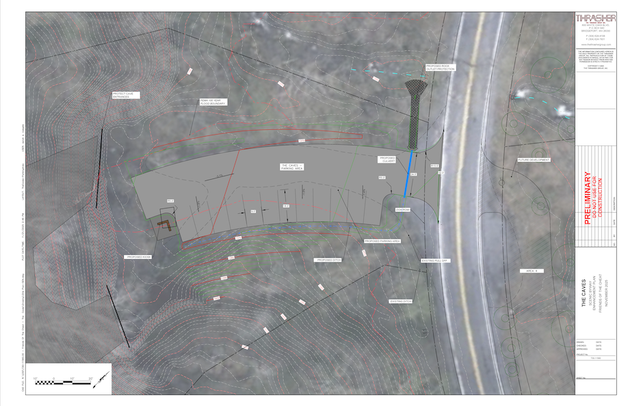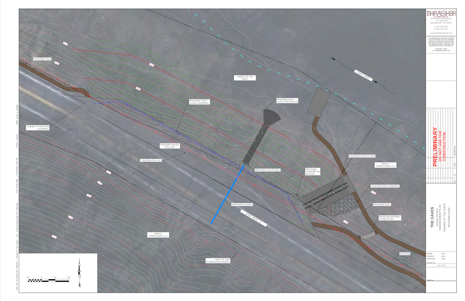 FOC worked with Thrasher Engineering to obtain environmental permitting approvals and finalize a 90% engineering plan to upgrade the historical river access with expanded parking and improved access, complete with concrete stairs and a raft slide. The Caves Parking area will be improved to expand as an overflow area and address safety concerns with the caves and Route 72. This work is supported by grants from the WV Partner Community Capital – Recreation Economy Initiative, WVU Brad & Alys Smith OEDC, Richard K. Mellon Foundation, and proceeds from our Whitewater Access campaign.
